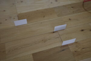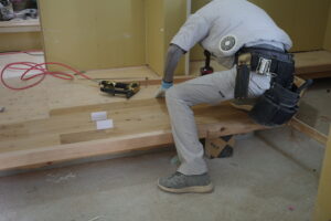 丁寧に貼り進められていく無垢材の床。